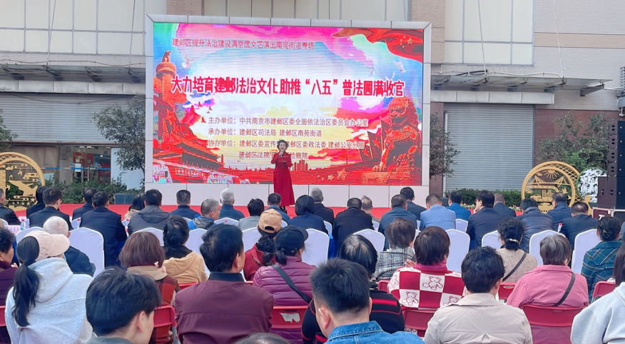近日,建邺区在南苑街道广场成功举办以“大力培育建邺法治文化 助推‘八五’普法圆满收官”为主题的法治宣传文艺演出暨“八五”普法工作总结会议。活动旨在全面展示“八五”普法以来区域法治建设成果,总结工作经验,凝聚奋进力量,为“八五”普法规划圆满收官营造浓厚氛围,并为未来法治宣传教育工作谋篇布局。