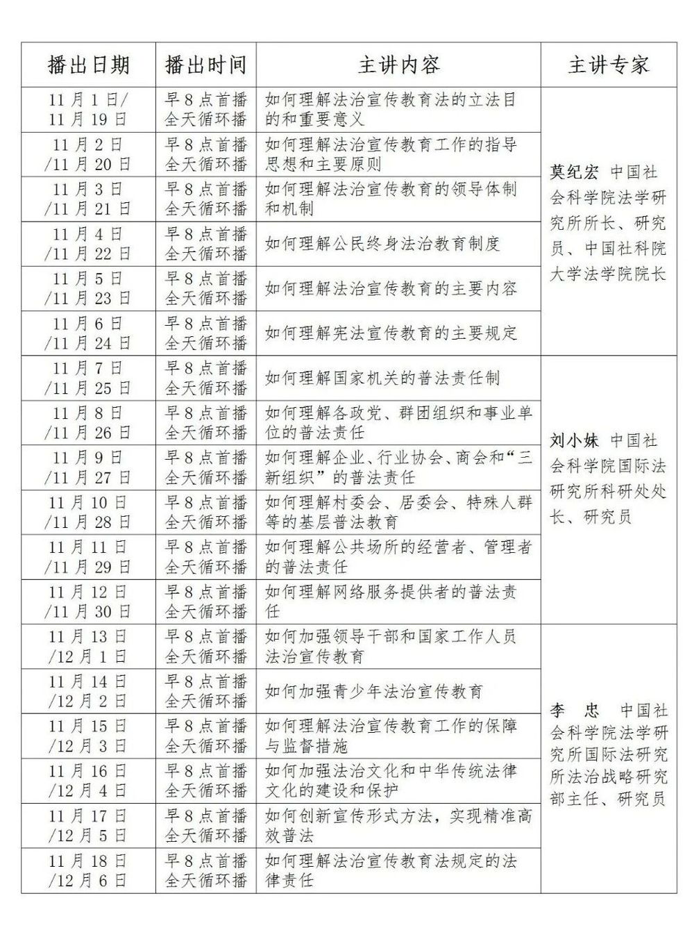 2025年11月1日-18日,每日早8点首播,全天循环播放。2025年11月19日-12月6日重播。
