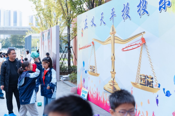 “法治小课堂”结束后,在广场上开展了有趣的“法治游园会”。游园会现场人头攒动,气氛热烈。法治漫画展板区展示了学生们创作的法治主题画作,充满童真与想象力;“法律知识转转乐”和“安全标志猜猜看”摊位前,同学们在游戏中巩固了法律与安全知识;“正义天平投投乐”游戏中,孩子们通过投掷沙包,直观地辨别了守法与违法行为;最受欢迎的莫过于“我是小法官/小律师”角色扮演合影区,同学们身着迷你法官袍、律师袍,手持法槌,在模拟法庭背景前拍照留念,体验了一把守护公平正义的庄重与神圣。整个游园会采用集章打卡的形式,学生们手持集章卡穿梭于各个摊位之间,在轻松愉快的氛围中潜移默化地接受了法治熏陶,集满印章后兑换的奖品更是为此次活动留下了美好的纪念。