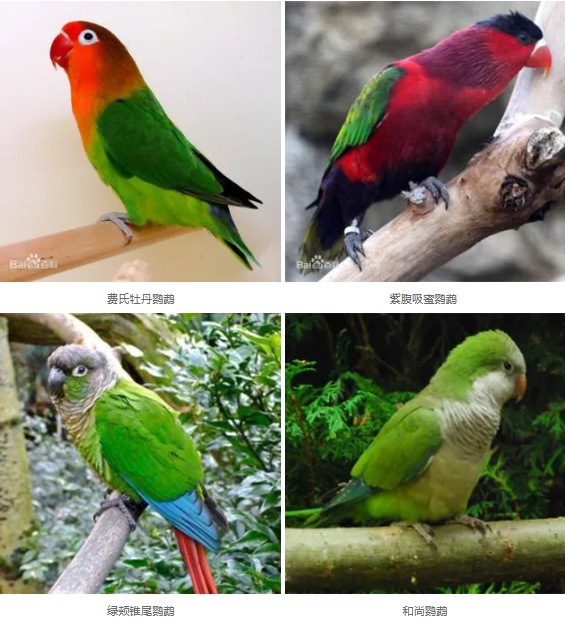 费氏牡丹鹦鹉、紫腹吸蜜鹦鹉、绿颊锥尾鹦鹉、和尚鹦鹉。这四种鹦鹉属于保护动物,但已纳入标识试点,个人可以购买加载专用标识的鹦鹉个体作为宠物饲养。